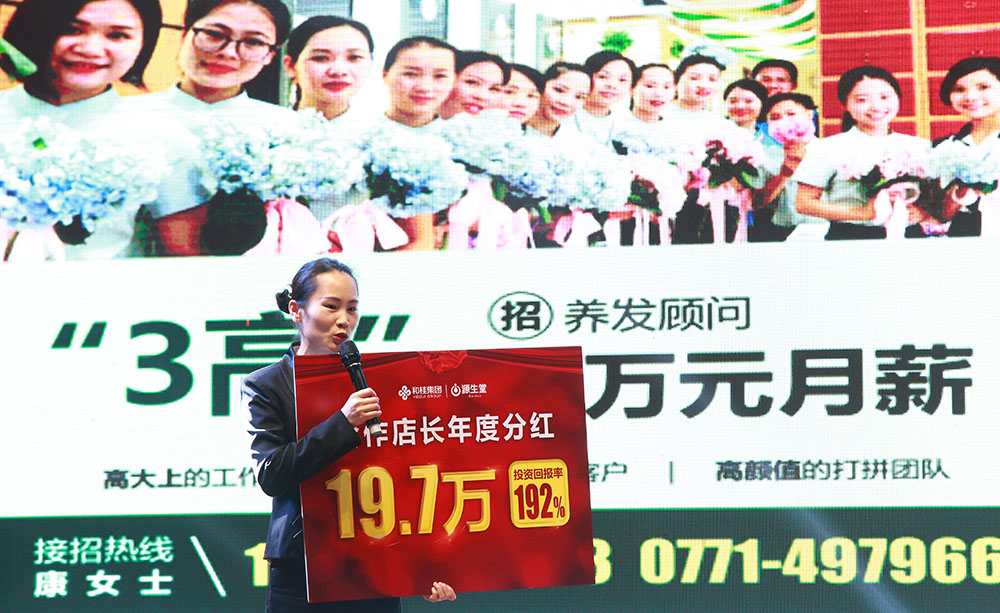 現(xiàn)場,和桂集團(tuán)總裁黃偉文先生、源生堂執(zhí)行總經(jīng)理舒志華女士,為源生堂幾十位優(yōu)秀合作店長代表,進(jìn)行2017年度百萬分紅頒獎。幾十位優(yōu)秀合作店長上臺領(lǐng)取個人年度分紅,除去工資后,最高個人年度分紅可達(dá)19萬元,引發(fā)全場尖叫與歡呼!舒總分享了《2018源生堂三大招》,現(xiàn)場招募養(yǎng)發(fā)顧問、合作店長、加盟老板,現(xiàn)場嘉賓及家人紛紛轉(zhuǎn)發(fā)分享。最后,黃總表示,2018年用分享成就未來,讓更多人實現(xiàn)老板夢。
