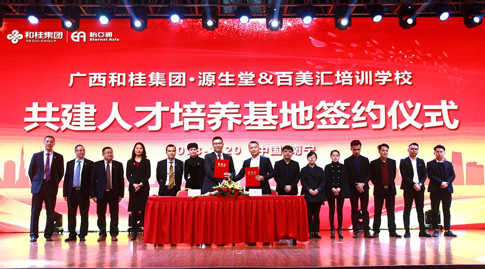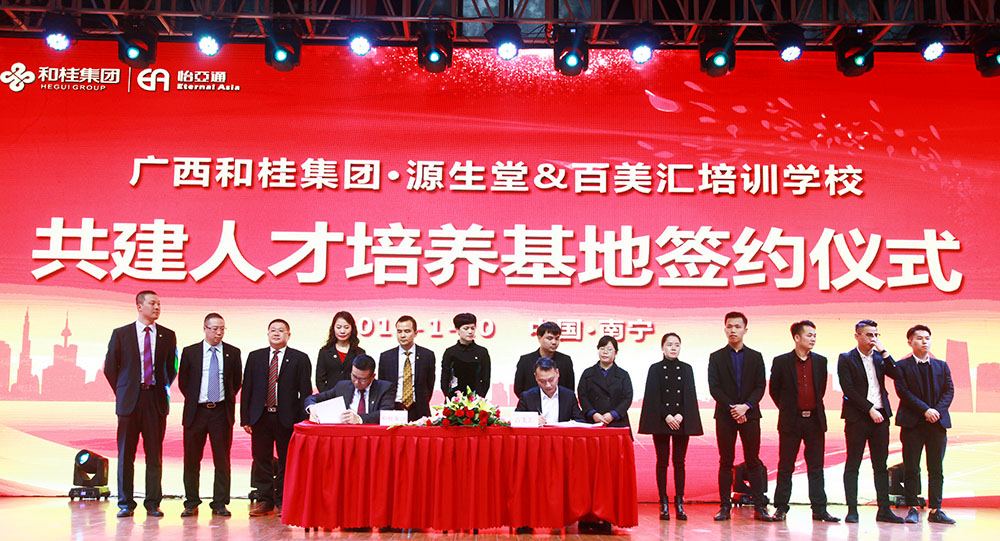 1月20日,源生堂與百美匯培訓(xùn)學(xué)校共建人才培訓(xùn)基地簽約儀式,在廣西和桂集團(tuán)2018年年會(huì)現(xiàn)場(chǎng)隆重舉行。此次簽約標(biāo)志著首個(gè)中國(guó)天然養(yǎng)發(fā)人才培養(yǎng)基地的成立。廣西和桂集團(tuán)總裁黃偉文先生、源生堂執(zhí)行總經(jīng)理舒志華女士、百美匯培訓(xùn)學(xué)校校長(zhǎng)王勇先生等領(lǐng)導(dǎo)出席本次簽約儀式。中央電視臺(tái)、廣西電視臺(tái)、南國(guó)早報(bào)、網(wǎng)易網(wǎng)、中國(guó)網(wǎng)、中國(guó)經(jīng)濟(jì)時(shí)報(bào)、新浪新聞、百度新聞等媒體,以及源生堂供應(yīng)商、加盟商、員工等近千人,共同見證了首個(gè)中國(guó)天然養(yǎng)發(fā)人才基地的簽約儀式。